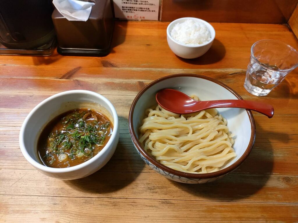 写真はつけ麺中(1.5玉)(税込1000円)。筆者は小ライスを追加で購入(税込100円)。麺は冷たい麺と温かい麺を選べます。写真からもわかるように光沢が出るほどのツルツル麺で濃厚魚介のつけ汁とよく絡み合います。店内に入るまで待機時間が発生する事、スープが無くなり次第営業終了ということもあるため、お店に行かれる際は早めに行くことをお勧めします。